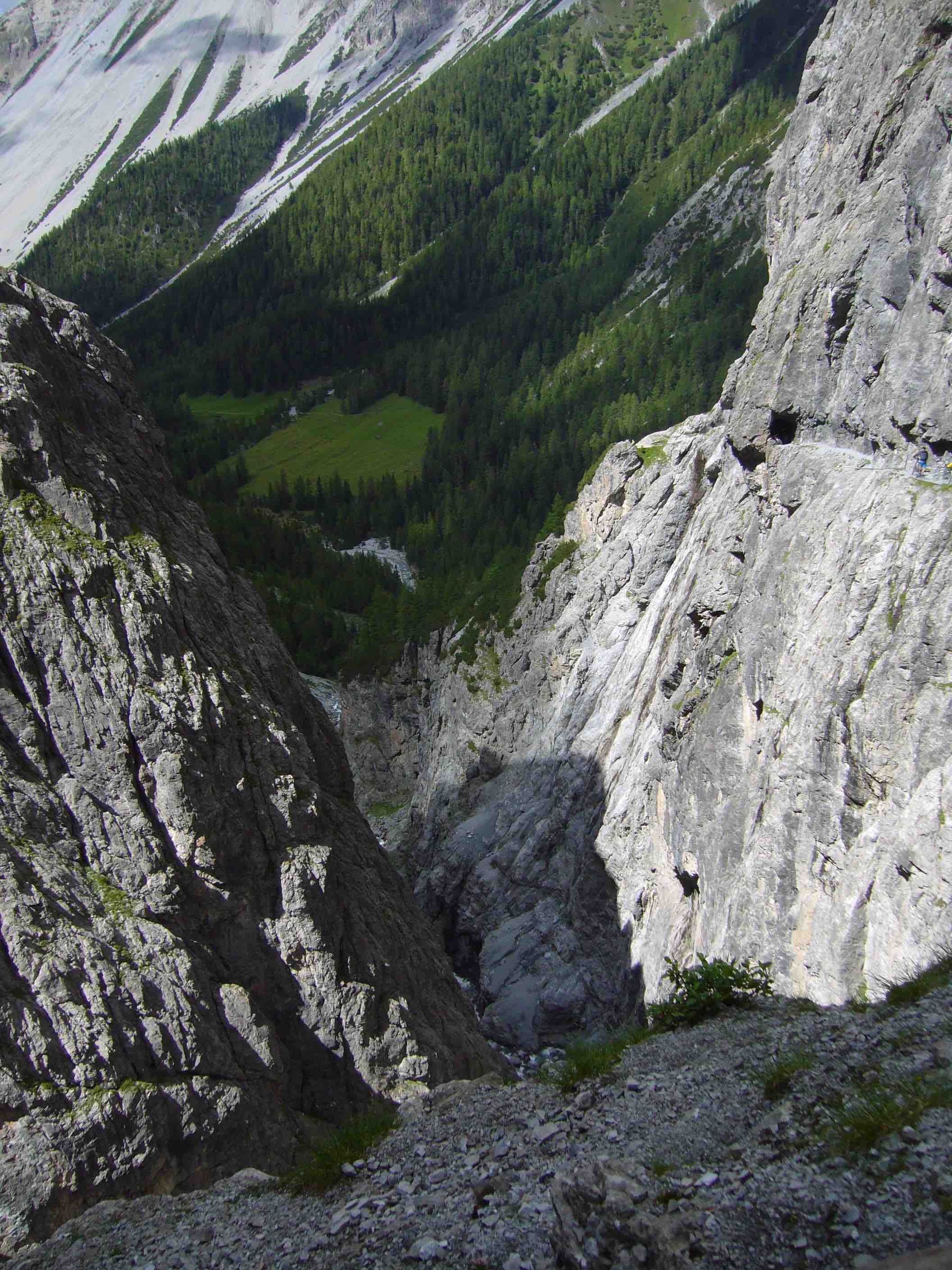 Tag 4 unserer Tour, sollte uns ins Val d’Uina führen. Letztes Jahr bei unserer Alpenüberquerung, mussten wir durch ein Defekt am MTB, die Etappe anpassen und den Passo di Costainos anstatt der Val d’Uina fahren. Aber heute sollte es klappen 🙂 Die fehlenden 10 Kilometer von gestern, d.h über Müstair zur italienischen Grenze nach Taufers waren schnell aufgeholt. Kilometer abwärts fuhren wir ins Vinschgau und waren schnell in Latsch. Die Beine waren auch nicht mehr so gut, so dass der lange Aufstieg von Schleiss in Schliniger Tal kräftezehrend war. Die Temperatur war in der Sonne sehr heiss und wir kamen auch langsam voran. In Schlinig war erstmal Pause angesagt und eine Konditorei musste mit einem Apfelstrudel sowie Sachertochte herhalten. Heute war Sonntag und viele Wanderer waren auf dem Weg zur Sesvenna-Hütte (2256hm). Ebenfalls war auf der Schliniger Alm ein Wiesenfest. Ab der Alm wurde der Weg sehr schwer und steil und ich musste schieben. Maurice hat es noch bis unterhalb des Wasserfalls gepackt, ab dann war es auch um ihn geschehen, und die restlichen Höhenmeter wurden geschoben. Nachdem die Kante (Schlinigpass) geschafft war war es nicht mehr weit zum Pforzheimer-Hütte (2256hm) sowie der Sesvenna-Hütte. Uber die Hochebene sind wir dann Richtung Schlucht weitergekommen. Ich bin noch durch eine Unaufmerksamkeit gestürzt, aber, zum Glück, ohne Folgen, und war ab jetzt wieder etwas vorsichtiger. Dann endlich gings in die Uina Schlucht. P1080742Einfach unbeschreiblich, denn auch aus unserer Richting kommt der ganze in den Felsen gehauener Weg der sich über fast einen Kilometer Länge und ca. 100Meter Tiefe, voll zur Geltung. Unbeschreiblich, muss man mit eigenen Augen sehen ! Naturlich ist es strengstens verboten die Schlucht zu fahren, denn viele Absicherungen sind fehl am Platz. Ab der Schlucht windet sich angangs ein schöner Trail und dann Schotterpiste dem Tal entlang bis nach Sur Enn an den Inn. Auf Fahrradweg fuhren wir nach Scuol wo wir eine Pause, erstens zum Bankomat, Chf tanken, und eine Limo auf einer Terasse zum Durstlöschen, ehe die restlichen 300hm nach Ftan gemeistert werden mussten. Die haben sich noch sehr in die Länge gezogen und waren anfangs auch auf kleinem Weg zu steil und mussten geschoben werden. Mir schöner Sicht aufs das Tal und Scuol, sowie dem Schloss Tarasp fuhren wir die restlichen Kilometer nach Ftan, einem sehr schönem Dörfchen. Wir bezogen unser Quartier im Hotel Bella Vista und hatten ein Zimmer mit Balkon und herrlicher Aussicht. Nach der Dusche mussten einige kühle Bier und gutem Essen im Restaurant diesen schönen Tag beenden.