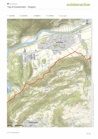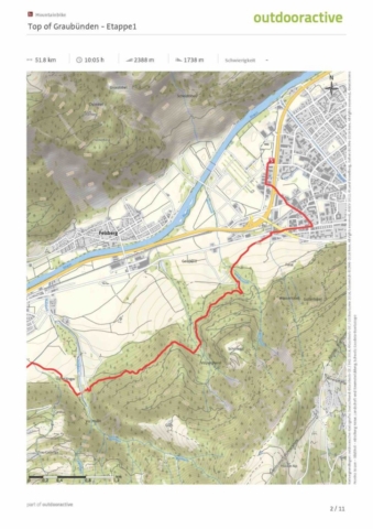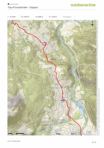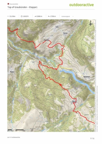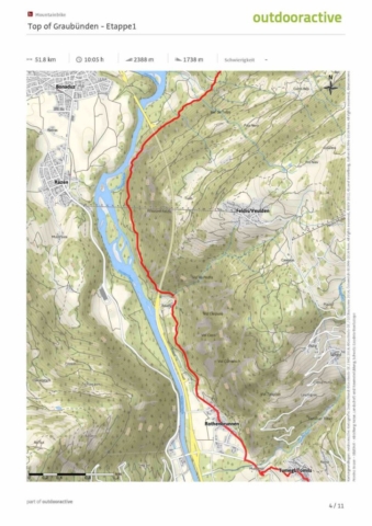 Roadbook : Von Chur fährt man auf dem Velolandweg talaufwärts. Nach Ems beginnt die kurze Steigung zum Polenweg, der dich hoch über dem Rhein nach Rothenbrunnen bringt. Jetzt beginnt die steile Steigung nach Tomils. Man kommt nun an vielen alten Schlössern und Burgen vorbei. Nach Scharans beginnt der „Alte Schyn“, ein Highlight dieses Tages. Kurz vor Muldain beginnt die längste Abfahrt dieser Etappe. Im Talboden angekommen erwartet dich auf der alten Solisbrücke ein spektakulärer Blick in die tiefe Schlucht. Der letzte lange Anstieg führt dich über die alten Bergdörfer Stierva und Mon ins Oberhalbstein. Mit wunderbarem Panorama über das Albulatal erreichst du dein erstes Etappenziel in Savognin.